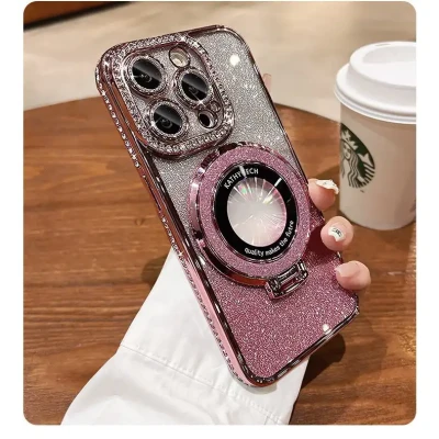 Compatible iPhone 16 Phone Case Electroplated Edge Rhinestone Gradient Glitter Apple 14 15 Pro Max Magnetic Stand